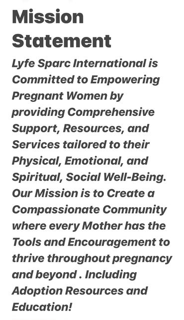 Lyfe Sparc International is Committed to Empowering Pregnant Women by providing Comprehensive Support, Resources, and Services tailored to their Physical, Emotional, and Spiritual, Social Well-Being. Our Mission is to create a Compassionate Community where every Mother has the Tools and Encouragement to thrive throughout pregnancy and beyond . Including Adoption Resources and Education!
