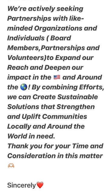 (Board Members,Partnerships and Volunteers) to Expand our Reach and Deepen our impact in the 🇺🇸 and Around the 🌎! By combining Efforts, we can Create Sustainable Solutions that Strengthen and Uplift Communities Locally and Around the World in need.